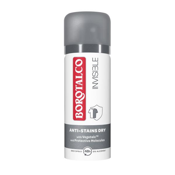 Embrassez l'expérience Borotalco avec le Borotalco Invisible! Sa formule est enrichie avec l'innovant Active Vegetalc™, un mélange de poudres absorbantes d'origine végétale, et de Molécules Protectrices: un réseau de molécules invisibles qui capture et ne transfère pas les halos, les odeurs et les taches, offrant ainsi un effet barrière entre la peau et les vêtements et une sensation de sécheresse. Efficace contre les taches blanches et jaunes, même sur des tissus délicats tels que la soie.