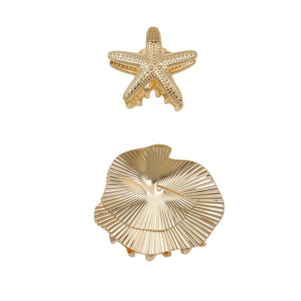 Ensemble de 2 pinces dorées en forme d’étoile de mer et de coquillage. Parfaites pour apporter brillance et glamour à vos coiffures, tout en restant raffinées. Ces pinces sont idéales pour un style chic estival ou pour des occasions spéciales.
