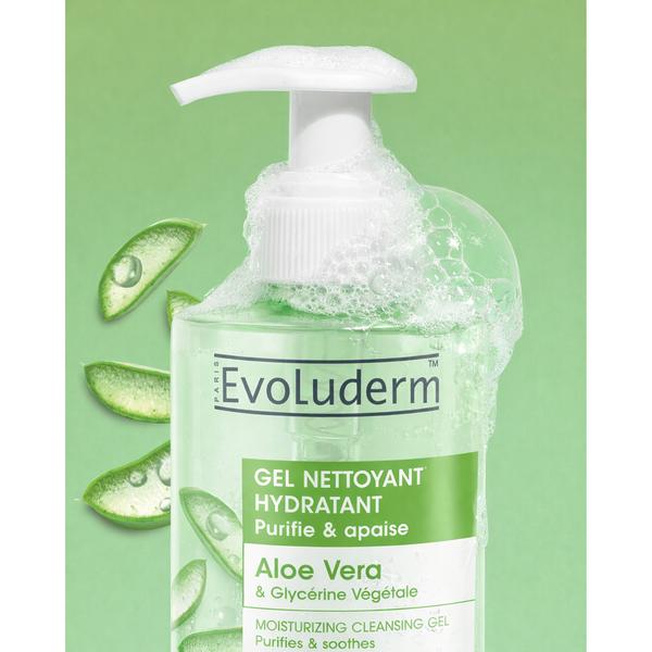 Le GEL NETTOYANT HYDRATANT Evoluderm élimine les impuretés et le maquillage en douceur, tout en offrant une sensation de fraîcheur instantanée. Formulé avec de l’Aloe Vera et de la Glycérine Végétale, il hydrate et apaise tous les types de peaux, même sensibles, pour un teint lumineux et éclatant au quotidien. Sa texture gel, fraîche et légère, se transforme en une mousse fine ultra-douce qui nettoie la peau tout en lui apportant un confort immédiat. Résultat : la peau est propre, nette et purifiée. Conseils d’utilisation : Matin et soir, appliquez une noisette de produit sur votre visage humidifié, faites mousser par mouvements circulaires en évitant le contour des yeux puis rincez à l’eau claire. En cas de projection dans les yeux, rincez abondamment et immédiatement à l’eau claire. Sans savon.