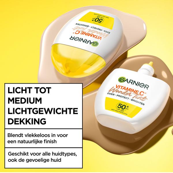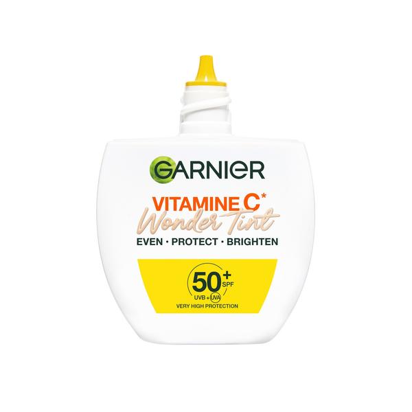 Le fluide teinté Garnier Vitamine C* Wonder Tint SPF 50+ en teinte « clair » est un soin quotidien à la texture légère qui fait des merveilles : Garnier Vitamine C* Wonder Tint SPF 50+ clair unifie instantanément le teint, protège, hydrate** et atténue les taches pigmentaires*** pour laisser la peau éclatante. De plus, il offre une couvrance légère à moyenne qui se fond parfaitement à la peau pour un fini naturel. Non gras, non collant, il convient à tous les types de peaux, y compris les peaux sensibles. Découvrez la routine complète Garnier Vitamine C* : Étape 1 : Commencez par l’Eau Micellaire Vitamine C* et/ou le Gel Nettoyant Doux Vitamine C*. Étape 2 : Le matin, utilisez le Sérum Booster d'Éclat Vitamine C+* pour une peau plus éclatante et moins de taches, et appliquez le Sérum de Nuit Éclat le soir après le nettoyage pour réduire les taches, le teint terne et les ridules. Étape 3 : Après le sérum, appliquez la Gelée Hydratante Sorbet Vitamine C* de Garnier pour une hydratation qui fond sur la peau avec une texture ultra-légère et fraîche. Étape 4 : Pour la journée, terminez votre routine avec un fluide Garnier Daily UV en version Glow ou Invisible pour protéger la peau des rayons UVA et UVB avec un SPF 50. *Vitamine Cg = un dérivé de la vitamine C, **Test consommateur sur 79 participants, 28 jours, ***Test clinique sur 55 taches pigmentaires, 55 participants.