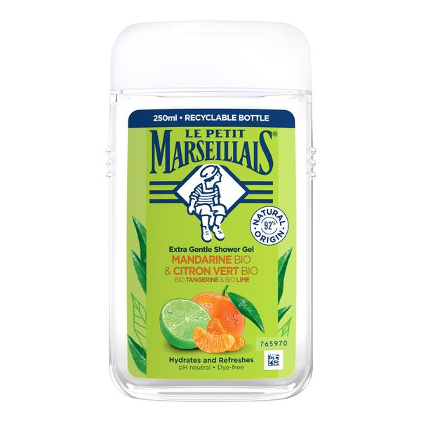 • Le Gel Douche Mandarine et Citron Vert Bio du Petit Marseillais lave en douceur votre peau, grâce à sa mousse légère qui libère un parfum fruité et acidulé , • Sa formule extra douce au pH neutre hydrate et nourrit votre peau; elle est testée sous contrôle dermatologique, • Ce gel douche est aussi formulé avec une base lavante d’origine végétale dont les ingrédients sont facilement biodégradables