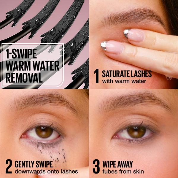 Étape 1. Utilisez la courbe intérieure pour atteindre la racine des cils. Étape 2. Balayez les cils de la racine à la pointe. Étape 3. Ne laissez pas sécher le mascara entre les couches. Étape 4. Enlevez facilement le mascara avec le démaquillant pour les yeux 100 % sans huile Maybelline Expert Eyes®.