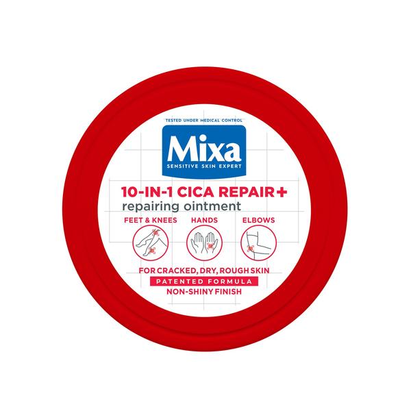 La pommade réparatrice Mixa 10-en-1 Cica Repair+ aide à réparer les peaux sèches et craquelées avec 40% de glycérine, de l'urée et de l'allantoïne. Prouvé cliniquement : réduit la sécheresse et la rugosité des coudes de 68%* et hydrate pendant 2 jours**. Cette formule brevetée innovante offre 10 bénéfices en un seul produit : aide à réparer, réduit les petites gerçures, diminue la rugosité et les callosités, rend la peau plus lisse, renforce, hydrate, apaise, rend la peau plus souple, donne un éclat radieux et convient au "slugging" comme masque de nuit. Les ingrédients puissants agissent en synergie : la glycérine hydrate intensément, l'urée soutient le renouvellement cutané pour réduire la rugosité, et l'allantoïne apaise et hydrate la peau. Les résultats cliniques montrent que 100% des utilisateurs ressentent une diminution des gerçures et des callosités*** et 100% trouvent la peau moins irritée****. De plus, 92% confirment que la rugosité est déjà réduite après une nuit de sommeil*****. Cette solution tout-en-un est spécialement développée voor les peaux sèches, rugueuses et craquelées des pieds, genoux, mains et coudes. La formule hypoallergénique est formulée et testée sous contrôle médical pour une sécurité optimale des peaux sensibles. Fini non gras, pénètre bien sans laisser de sensation collante.