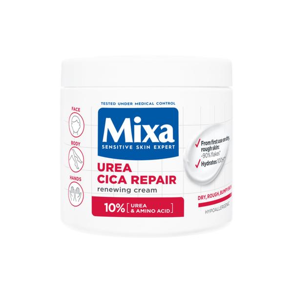 Mixa Urea Cica Repair est une crème réparatrice spécialement conçue pour les peaux sèches et rugueuses présentant des rugosités, des squames et des zones de sécheresse, souvent associées à la kératose pilaire. Cette peau se reconnaît à ses petits boutons rouges, par exemple sur le haut des bras et les jambes. Elles sont généralement rugueuses au toucher. Dès la première utilisation, la crème rend la peau sèche et rugueuse plus lisse et plus douce. La formule avancée est enrichie en 10% [URÉE & ACIDE AMINÉ] et aide à réparer la peau. En effet, l'urée favorise le renouvellement cutané et réduit ainsi la rugosité. De plus, la formule, avec l'acide aminé glycine, aide à restaurer la barrière cutanée pour prévenir la perte d'hydratation.
