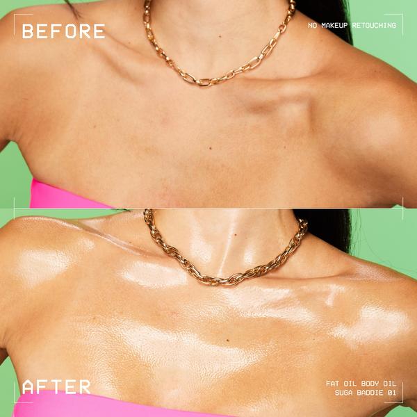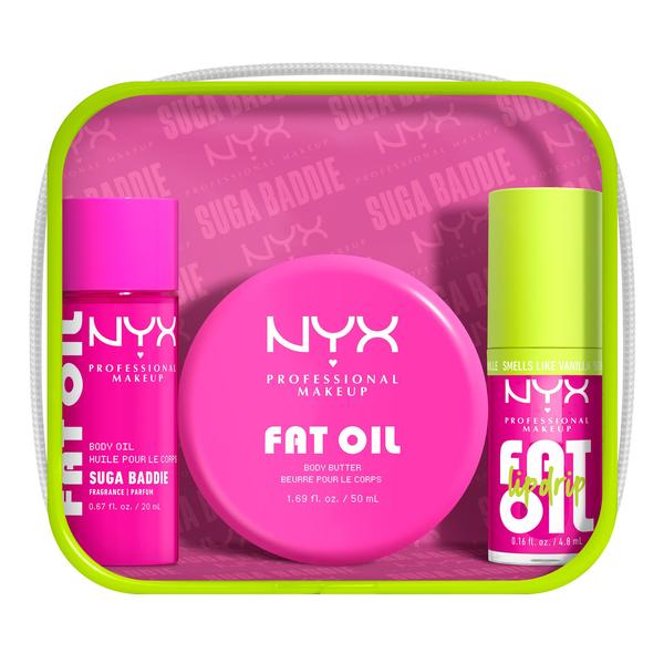 Un éclat FAT* pour les baddies en déplacement ! Profitez d'une hydratation FAT* et d'une brillance FAT* de la tête aux pieds avec nos nouveaux kits NYX Professional Makeup Fat Oil Lip & Body ! Ce kit prêt à voyager contient l'iconique Fat Oil Lip Drip, la Fat Oil Mini Body Oil et le Fat Oil Mini Body Butter, le tout dans une jolie pochette réutilisable. Que vous rayonniez avec une huile corporelle ultra-brillante, que vous profitiez d'une peau douce comme du beurre ou que vous apportiez une touche juteuse à vos lèvres, ce kit vous assure un éclat FAT* toute la journée, tous les jours ! Choisissez votre vibe avec deux kits différents aux deux parfums emblématiques de NYX. Devenez un véritable 'snack' avec notre kit Suga Baddie pour un aspect de peau délicieusement brillant au doux parfum de biscuit à la vanille. Ou révélez la diva qui est en vous avec notre kit Caramelt Mami pour un scintillement bronzé et luxueux sur tout le corps et un riche parfum de caramel. *Intense