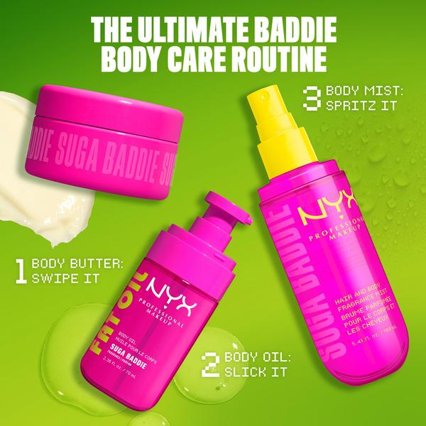 Le NYX Professional Makeup Fat Oil Suga Baddie Hair & Body Mist est votre touche finale ultime pour un parfum sucré et sensuel qui dure toute la journée. Ce parfum polyvalent pour cheveux et corps, avec ses arômes irrésistibles de vanille crémeuse et de gourmandises sucrées, laisse une impression inoubliable. Plus qu'un simple parfum, c'est une déclaration forte qui propulse votre énergie "baddie" au niveau supérieur.