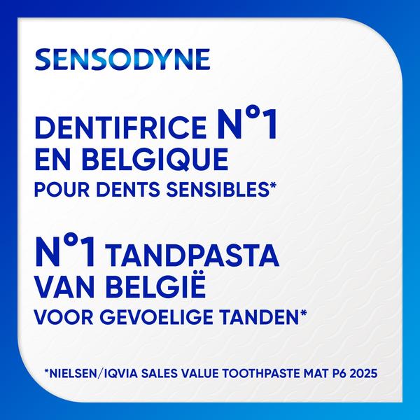 •Soulage la sensibilité douloureuse avec un brossage 2 fois par jour •Formule unique à la Novamin •Sensodyne: Dentifrice N°1 en Belgique pour les dents sensibles (Nielsen, IQVIA dentifrice value sales MAT P6 2025) |