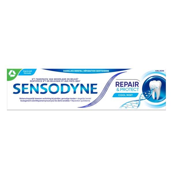 Le dentifrice Sensodyne Repair & Protect Cool Mint répare les dents sensibles* et soulage la sensibilité douloureuse**. Sensodyne Repair & Protect est un dentifrice quotidien au fluorure et composé d'un tube, d'un capuchon et d'une boîte en carton qui sont recyclables. Sa formule unique à la Novamin est cliniquement prouvée, essayez-le. Sensodyne: Dentifrice N°1 en Belgique pour les dents sensibles***.