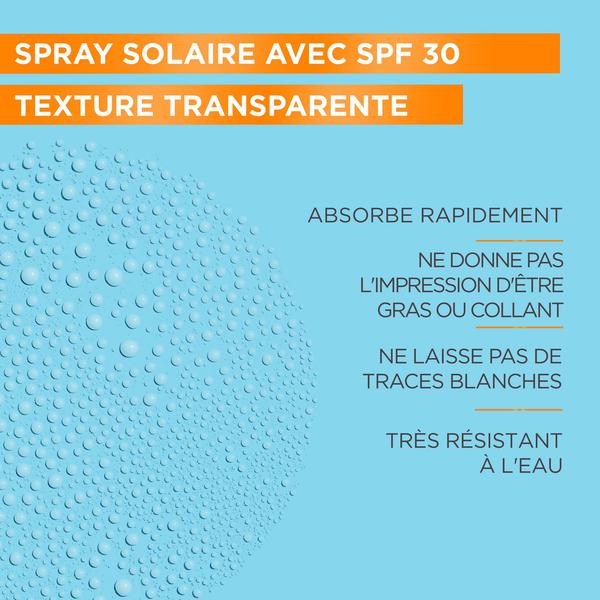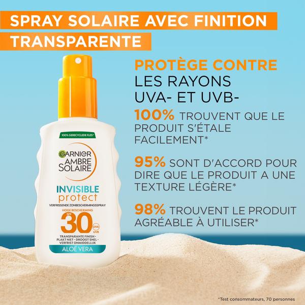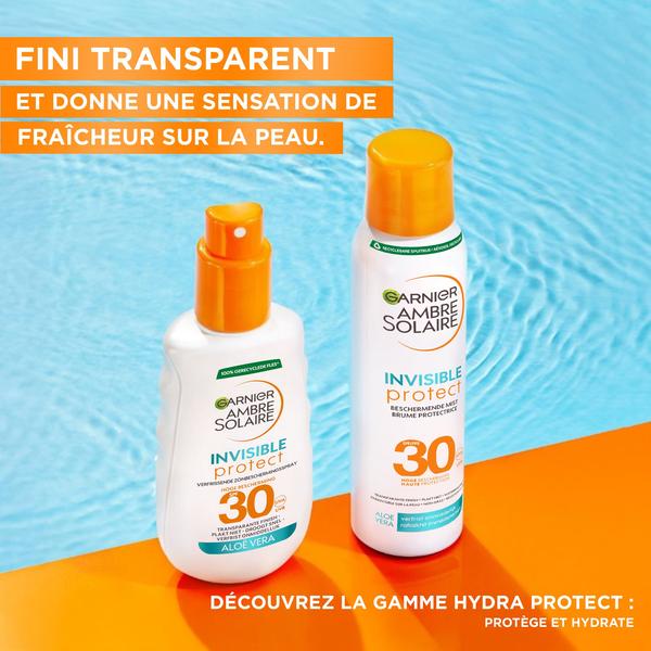 Protégez votre peau avec ce spray solaire Garnier Ambre Solaire Protection SPF 30. Le spray est enrichi à l'Aloe Vera, hydrate la peau et lui donne une sensation rafraîchissante grâce à sa texture transparente. La formule assure que ce spray solaire ne laisse pas de traces blanches. La formule pénètre rapidement et n'est pas grasse ni collante.