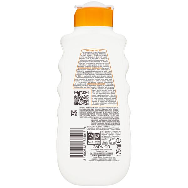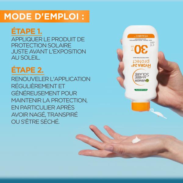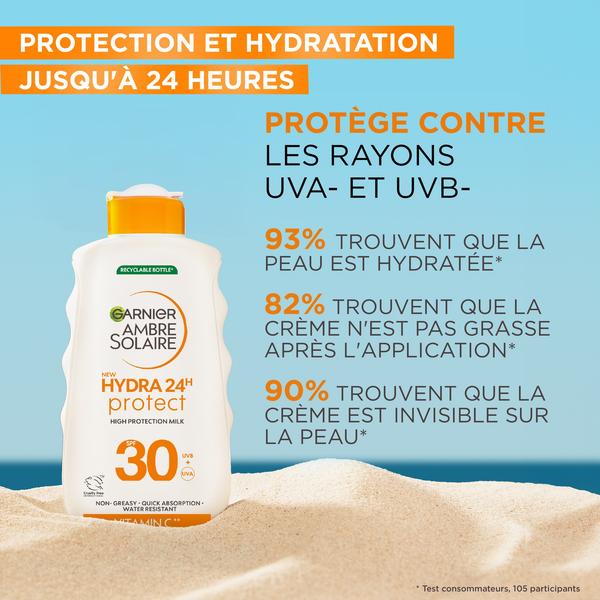 Protégez et hydratez durablement votre peau avec le lait solaire hydratant Garnier Ambre Solaire SPF 30. Enrichi en vitamine Cg, il hydrate 24 heures et aide à prévenir les signes du vieillissement cutané dû au soleil. Résistant à l'eau, à la transpiration et au sable. Pénètre rapidement, non gras, non collant et ne laisse pas de traces blanches.