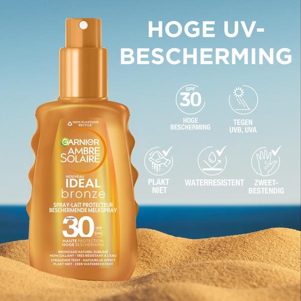 Le spray-lait protecteur SPF 30 Garnier Ambre Solaire Ideal Bronze protège contre les rayons UVA et UVB. Le lait solaire est résistant à l’eau, ne colle pas et offre un teint lumineux avec un effet naturel. Grâce aux produits Ideal Bronze de Garnier, vous protégez votre peau tout en lui offrant un teint lumineux, pour un effet bronzé.