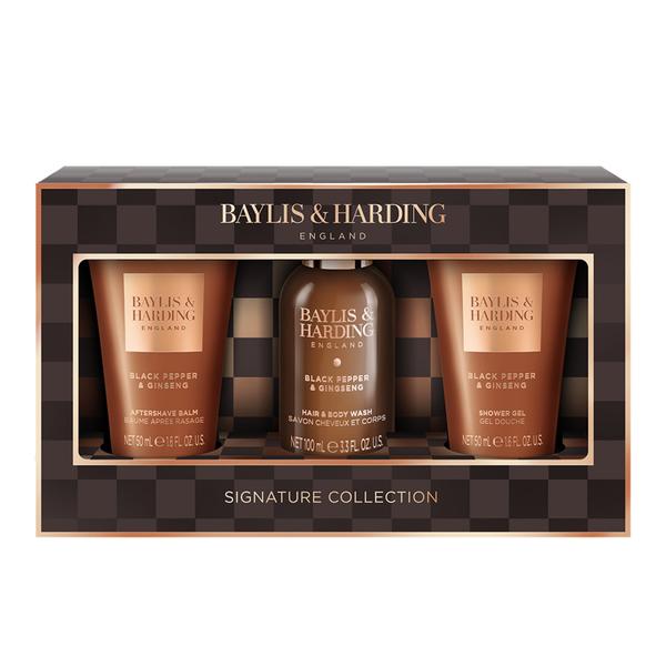 Le coffret PEPPER & GINSENG MEN contient un flacon Hair & Body Wash de 100 ml, un tube Aftershave Balm de 50 ml et un tube Shower Gel de 50 ml.