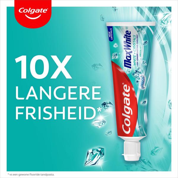 Bénéficiez d'une blancheur et d'une fraîcheur quotidiennes grâce au dentifrice Colgate Max White White Crystals, conçu pour révéler la blancheur naturelle de vos dents et un sourire éclatant. Doté de la technologie FreshFX, qui offre une fraîcheur 10 fois plus longue qu'un dentifrice au fluor classique, ce dentifrice blanchissant vous offre une puissante explosion de fraîcheur que vous adorerez. Il nettoie également votre bouche et protège contre les caries, pour un brossage optimal à chaque fois.