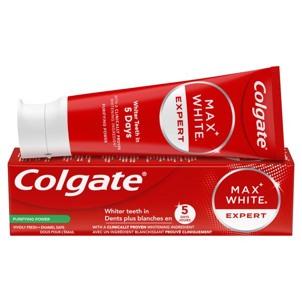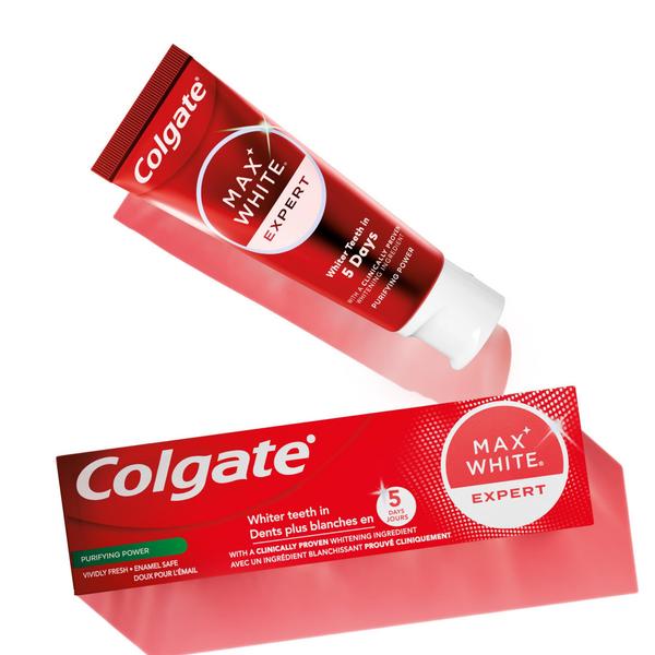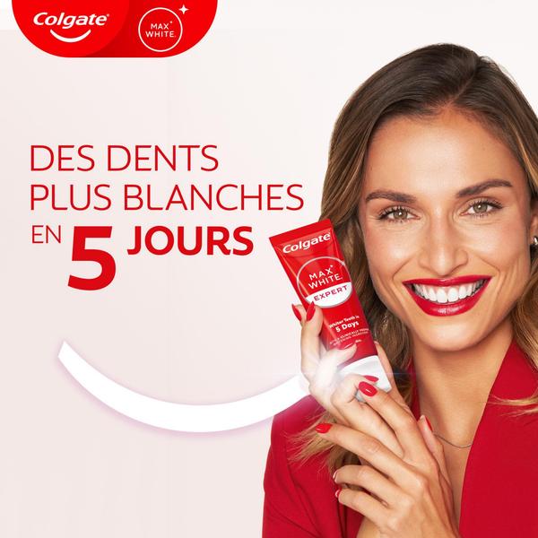Préparez-vous à faire sensation avec un sourire plus blanc en seulement 5 jours grâce au dentifrice Colgate Max White Expert Pouvoir Purifiant. Ce dentifrice blancheur contient du peroxyde d’hydrogène, un actif blanchissant dont la capacité à éliminer des années de taches a été cliniquement prouvée*. Le dentifrice au peroxyde d’hydrogène élimine les taches de café et de thé en surface tout en agissant en profondeur*, vous permettant d’afficher un sourire éclatant. Par ailleurs, il peut être utilisé au quotidien sans abîmer l’émail. Avec sa technologie micellaire, ce dentifrice blancheur élimine les impuretés, et son goût très frais rafraîchira votre haleine bien au-delà de vos attentes ! Le dentifrice blanchissant au peroxyde d’hydrogène contient aussi du fluor pour protéger votre émail et lutter contre les caries. Rendez votre sourire plus blanc et plus éclatant avec le dentifrice Max White Expert Pouvoir Purifiant de Colgate. *Élimine les taches ordinaires incrustées dans l’émail au fil du temps, après 4 semaines d’utilisation, 2 fois par jour.