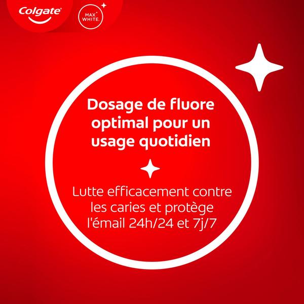Préparez-vous à faire sensation avec un sourire plus blanc en seulement 5 jours grâce au dentifrice Colgate Max White Expert Protection Sensibilité. Ce dentifrice blancheur contient du peroxyde d’hydrogène, un actif blanchissant dont la capacité à éliminer des années de taches a été cliniquement prouvée*. Le dentifrice au peroxyde d’hydrogène élimine les taches de café et de thé en surface tout en agissant en profondeur*, vous permettant d’afficher un sourire éclatant. Par ailleurs, il peut être utilisé au quotidien sans abîmer l’émail. Ce dentifrice est spécialement conçu pour protéger en permanence les dents sensibles et l’émail**, et peut être utilisé pour blanchir les dents sensibles. Avec son goût de menthe fraîche, il rafraîchira votre haleine bien au-delà de vos attentes ! Le dentifrice blanchissant au peroxyde d’hydrogène contient aussi du fluor pour protéger votre émail et lutter contre les caries.
