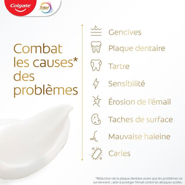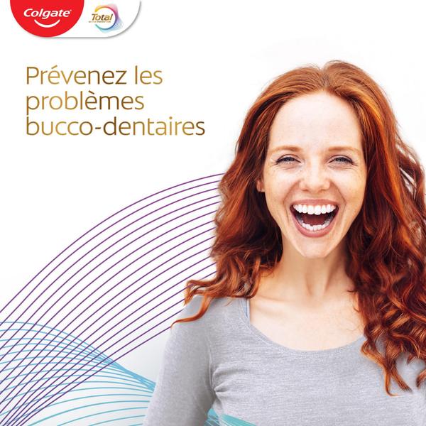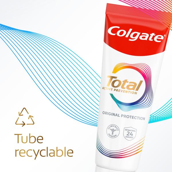Prendre soin de la santé de votre sourire et le protéger commence avant l'apparition des problèmes bucco-dentaires. C'est pourquoi le dentifrice Colgate Total Active Prevention Original, avec sa nouvelle formule, a été scientifiquement conçu pour une prévention active et pour lutter contre les causes profondes* de nombreux problèmes bucco-dentaires³. Grâce à sa protection antibactérienne 24 h¹ cliniquement prouvée et à son système unique² qui stabilise l'ingrédient actif préventif, il offre une performance supérieure⁴. Exactement ce dont vous avez besoin pour protéger votre sourire des futurs problèmes bucco-dentaires.