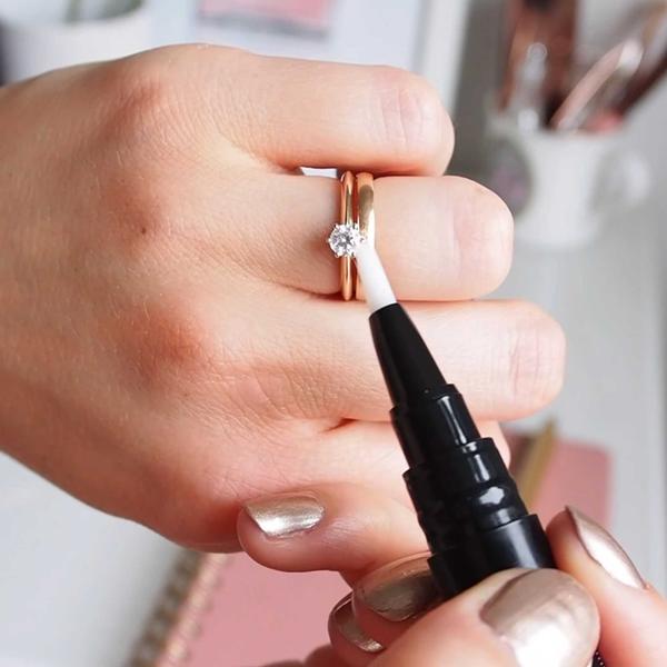 Le bout du stylo est composé d’une petite brosse douce qui permet de nettoyer en douceur tous les moindres recoins du bijoux, derrière les pierres et les montures.