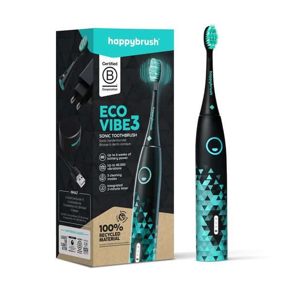Voici la brosse à dents sonique EcoVIBE 3 ! Son boîtier est fabriqué à partir de 100 % de matériaux recyclés * et sa batterie haute performance dure jusqu'à 6 semaines, prête pour toutes les aventures. Avec 40 000 vibrations ultra-efficaces, 3 modes de nettoyage personnalisés et des brins triple-action de haute qualité, elle assure un nettoyage en profondeur tout en douceur. (*Boîtier du manche et de la station de charge)