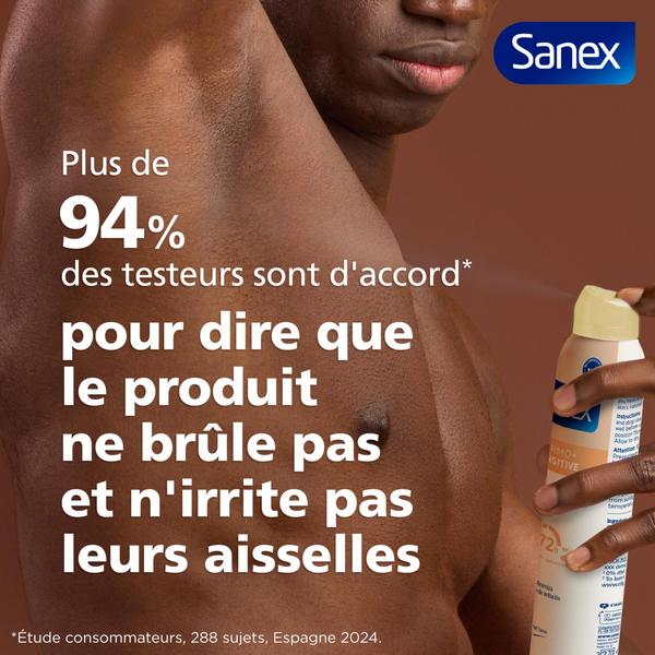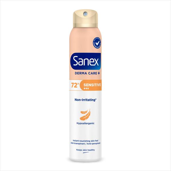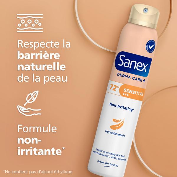Le spray anti-transpirant 72h Sanex Derma Care+ Sensitive vous apporte fraîcheur et confiance pour profiter de ce que la journée vous réserve. Il possède une formule non irritante* et offre une protection efficace et longue durée contre la transpiration et les mauvaises odeurs. Spécialement formulé pour procurer une sensation instantanée de peau nourrie, cet anti-transpirant pour les peaux sensibles, recommandé par des dermatologues¹, ne contient pas d’alcool* et est conçu pour garder la peau au frais et au sec tout en offrant une protection efficace et douce contre les odeurs indésirables. De plus, cet anti-transpirant spray sans alcool a été testé sous contrôle dermatologique et contribue à protéger la peau de vos aisselles des irritations grâce à sa formule douce. Affrontez facilement les journées bien remplies avec cet anti-transpirant longue durée qui offre à votre peau le respect qu’elle mérite. ¹En hypermarchés et supermarchés, étude 2024 IPSOS, 110 dermatologues en France, 45 en Belgique. *Ne contient pas d'alcool éthylique.