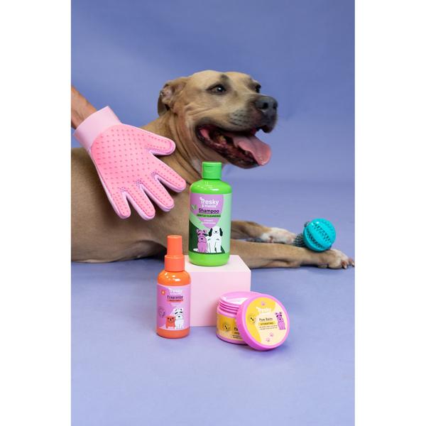 Cette collection complète de soins pour chiens contient tout ce dont vous avez besoin pour garder votre compagnon à quatre pattes heureux et éclatant. Avec notre shampooing au thé vert, son pelage sera propre et brillant, tandis que le baume à la camomille apporte calme et hydratation à sa peau sensible. La fragrance pêche laisse un parfum frais et longue durée, et le gant-brosse rend le toilettage facile et agréable. De plus, le jouet inclus garantit des heures de plaisir et de joie.