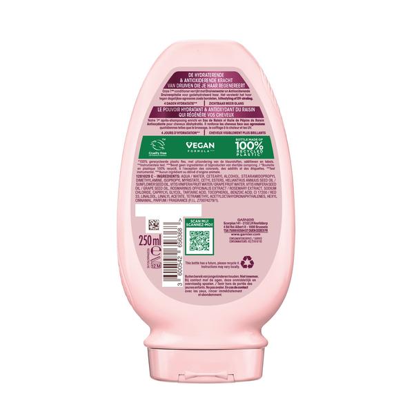 HYDRATE INTENSIVEMENT jusqu'à 4 jours* et démêle instantanément. RÉSULTAT : cheveux doux, faciles à coiffer et brillants. ENRICHIE EN eau de raisin hydratante et huile de pépins de raisin N'ALOURDIT PAS et convient à un usage quotidien FORMULE VÉGANE***, non testée sur les animaux FLACON FABRIQUÉ À PARTIR DE PLASTIQUE 100 % RECYCLÉ** |