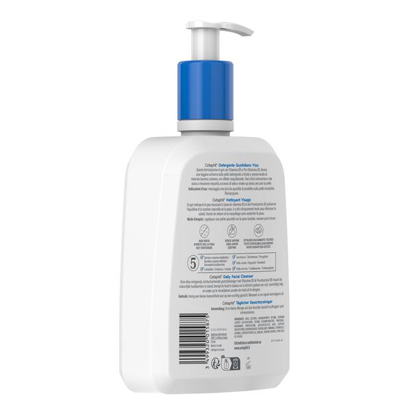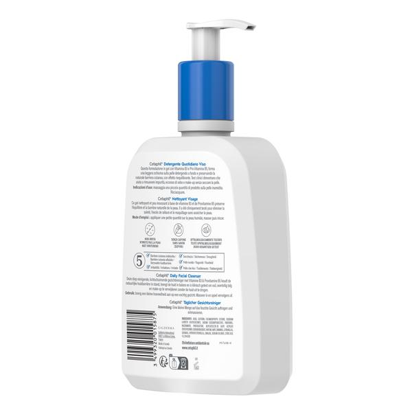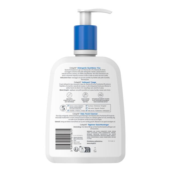 Cetaphil Daily Facial Cleanser is een licht schuimende gel die de huid diep reinigt en de zichtbaarheid van poriën minimaliseert. Hij is klinisch getest om vuil, overtollige oliën en make-up te verwijderen zonder de huid droog of strak achter te laten. Hij is geformuleerd met vitamine B3 en provitamine B5 om de natuurlijke huidbarrière te behouden. Hij beschermt tegen 5 tekenen van huidgevoeligheid, waaronder een verzwakte huidbarrière, droogheid, ruwheid, jeuk en strakheid.