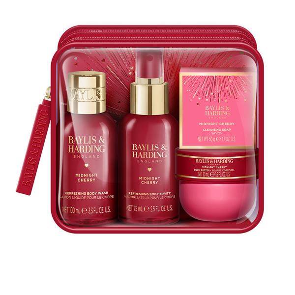 De giftset midnight cherry travel bevat 100ml Bodywash, 75ml body spritz, 50gr Body butter en 50gr zeep