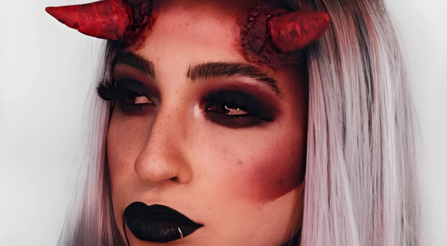 Verleidelijk en duivels tegelijk, de devil look draait helemaal om rood, zwart en een flinke portie attitude. Denk aan felrode lippen die meteen de aandacht trekken, intense smoky eyes met een twist, en misschien zelfs wat rode oogschaduw als contour voor die extra dramatische touch. Maak het af met de iconische (nep)hoorntjes om je look compleet te maken.