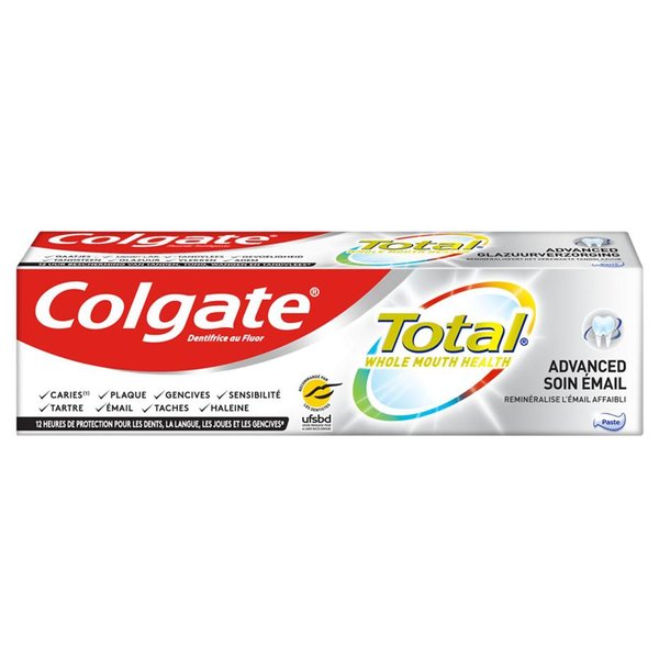 Colgate Total Advanced Glazuurverzorging Tandpasta helpt bacteriën 24 uur lang te bestrijden en het glazuur te versterken en te beschermen. Het zorgt voor een superieure vermindering van bacteriën op tanden, tong, wangen en tandvlees in vergelijking met een niet-antibacteriële fluoridetandpasta, bij continu gebruik 2x daags na 4 weken.