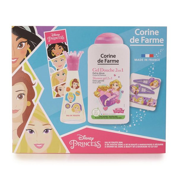 Ontdek de betoverende wereld van je favoriete Disney-prinsessen met deze Prinsessen cadeauset van Corine de Farme. Het bevat 1 zachte en fruitige eau de toilette (30 ml), 1 douchegel (250 ml), 1 schoonheidsset (2 haarspeldjes en 1 elastische armband) en 1 boekenlegger om uit te knippen.