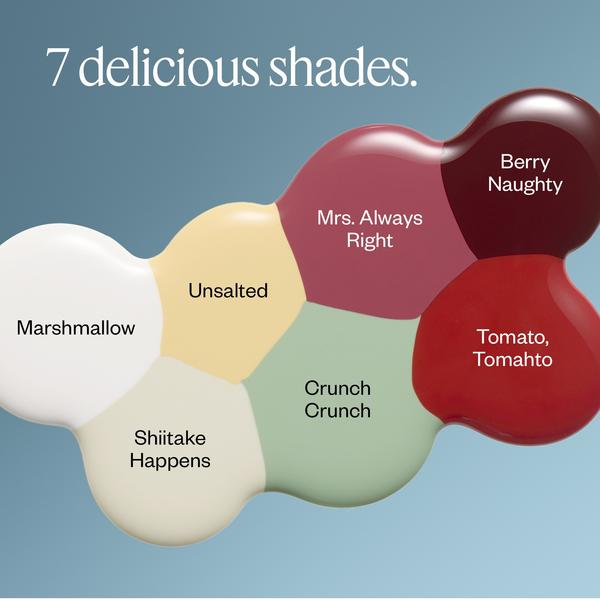 Duik in een wereld van smaken en kleuren met de essie Gourmet Grocery collectie, waar elke tint pure verleiding is! Geïnspireerd door heerlijke food vibes bestaat deze collectie uit 7 onweerstaanbare, “vers geplukte” kleuren: van sappig tomatenrood tot zacht botergeel, met leuke namen zoals Marshmallow (een romig wit) en Berry Naughty (een intens bessenrood). Het fijne? Je geniet van een perfecte, stralende manicure zonder UV-lamp. Elke lak dekt prachtig in twee lagen dankzij de salonkwaliteit formule. De exclusieve applicatorborstel glijdt soepel over je nagels en verdeelt de kleur gelijkmatig voor een perfect resultaat, gewoon met luchtdroging. Voor extra lange houdbaarheid verzorg je je nagels met een base coat tegen chippen en maak je de look af met een top coat voor snelle droging, langdurige glans en extra shine, zonder speciale apparatuur.
