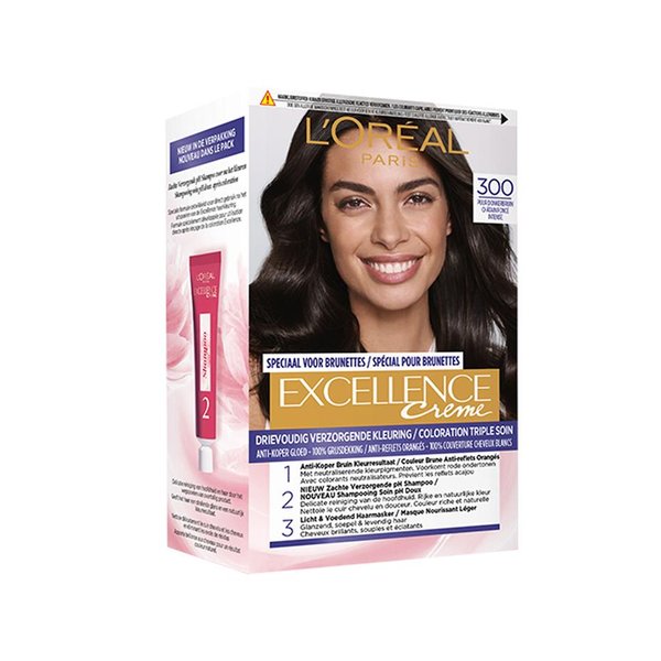 Ontdek de drievoudig verzorgende crèmekleuring van Excellence, een permanente kleuring voor rijke, bruine lokken, zonder sporen van grijze haartjes. De kleurcrème bevat Pro-Keratine, wat het haar versterkt en revitaliseert. Het beschermende serum met ceramide strijkt de haarschubben plat waardoor het haar weer glad en zijdezacht aanvoelt. De verzorging tenslotte zit boordevol collageen en helpt je lokken zich te herstellen.