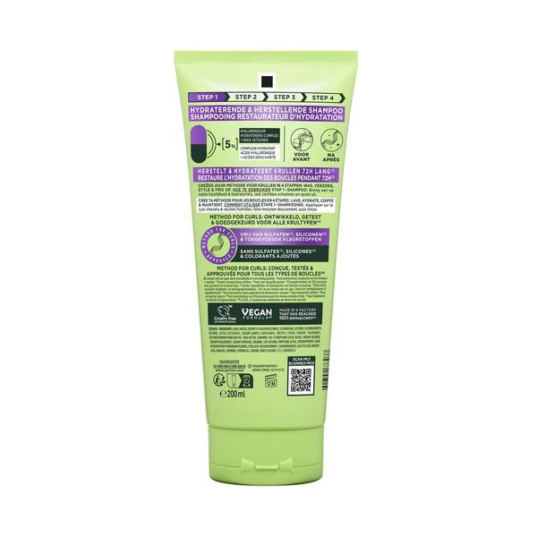 De Curls Method Shampoo (Stap 1) reinigt zacht en herstelt de hydratatie van krullen 72u lang*. Formule zonder sulfaten** en siliconen, verrijkt met 5% [Hyaluronzuur + Shea] complex.Start je krulroutine met stap 1: de Hydraterende & Herstellende Curls Method Shampoo van Garnier Fructis. Ontwikkeld, getest en goedgekeurd voor alle krultypen, brengt deze methode de verzorging van getextureerd haar naar een hoger niveau.