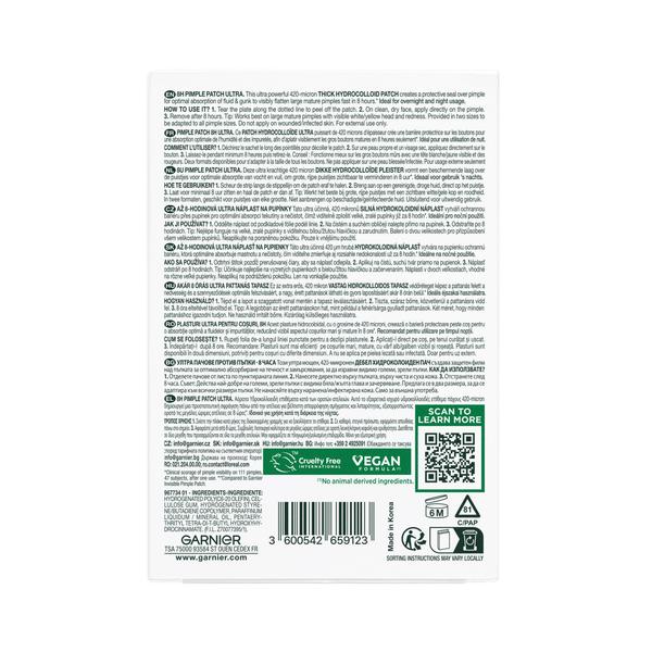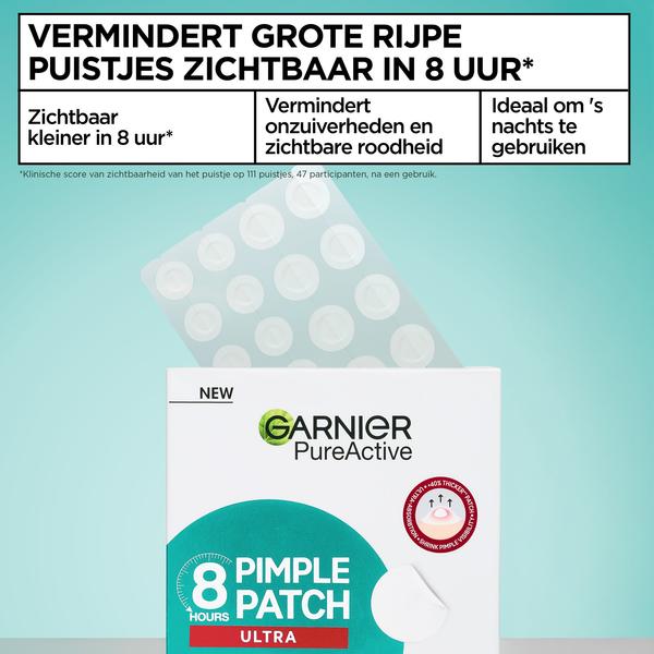 Garnier PureActive Pimple Patch Ultra biedt een revolutionaire oplossing voor het verminderen en beschermen van grote, rijpe puistjes met bewezen resultaten. Deze ultra krachtige hydrocollïde patches zijn 420 micron dik en vormen een beschermende laag over puistjes voor optimale absorptie van vocht en vuil. De patches zijn speciaal ontworpen om puistjes zichtbaar te verminderen in slechts 8 uur*, waardoor ze ideaal zijn voor nachtelijk gebruik. Met een dikte die 40% meer** is dan standaard patches, bieden ze 2x meer absorptie**. De hydrocollïde technologie trekt onzuiverheden uit de poriën terwijl het de huid beschermt tegen externe bacteriën en vervuiling. Bewezen resultaten tonen aan dat 94% van de gebruikers bevestigt dat hun onzuiverheden geen vlekjes achterlieten, en 96% is het ermee eens dat de patch beschermt en puistjes minder zichtbaar maakt***. Het product is getest onder dermatologische controle.