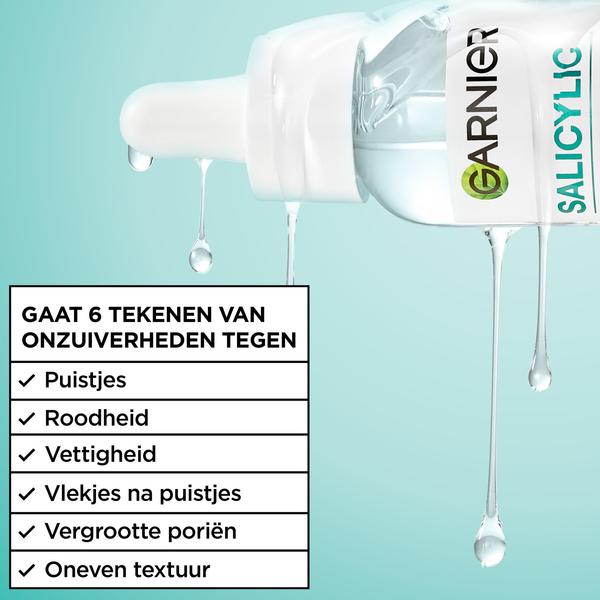 Ontdek ons eerste anti-imperfecties serum: Garnier Pure Active Salicylic Anti-Imperfecties Serum, de formule die klinisch bewezen onzuiverheden zichtbaar vermindert in 7 dagen*. De formule is verrijkt met niacinamide + glycerine + melkzuur + salicylzuur + centella asiatica. Het Garnier Pure Active Salicylic Anti-Imperfecties Serum gaat 6 tekenen van onzuiverheden tegen: puistjes, roodheid, vettigheid, vlekjes na puistjes, vergrootte poriën en een oneven textuur. Het is een snel absorberende lichtgewicht formule met klinisch bewezen effectiviteit: zo voelt de huid direct gladder**, in 3 weken -44% minder onzuiverheden* en biedt het 8 uur lang oliecontrole***. Nieuwsgierig naar de werkzaamheid van de actieve ingrediënten? Niacinamide vervaagt achtergebleven vlekjes na puistjes, glycerine hydrateert & verzacht de poriën, melkzuur verbetert de huidtextuur, salicylzuur exfolieert onzuiverheden en centella asiatica kalmeert de huid. Het serum is getest onder dermatologische controle en is geschikt voor de gevoelige huid. Ontdek de volledige Ganier PureActive Salicylic Routine: Stap 1: Reinig de huid met de Garnier PureActive Salicylic Anti-Imperfecties Gezichtsreinigingsgel. Stap 2: Verzorg de huid na het reinigen met de Garnier PureActive Salicylic Exfoliërende Liquid Care om poriën te verfijnen en de teint te egaliseren. Stap 3: Breng het Salicylic Serum aan om onzuiverheden zichtbaar te verminderen. Stap 4: Gebruik zowel 's ochtends als 's avonds de Garnier Salicylic Fresh & Matte hydraterende Sorbet gezichtscrème, en gebruik overdag eventueel nog de UV fluid om de huid te beschermen. Stap 5: Verminder en bescherm puistjes met de Garnier Pure Active Pimple Patches