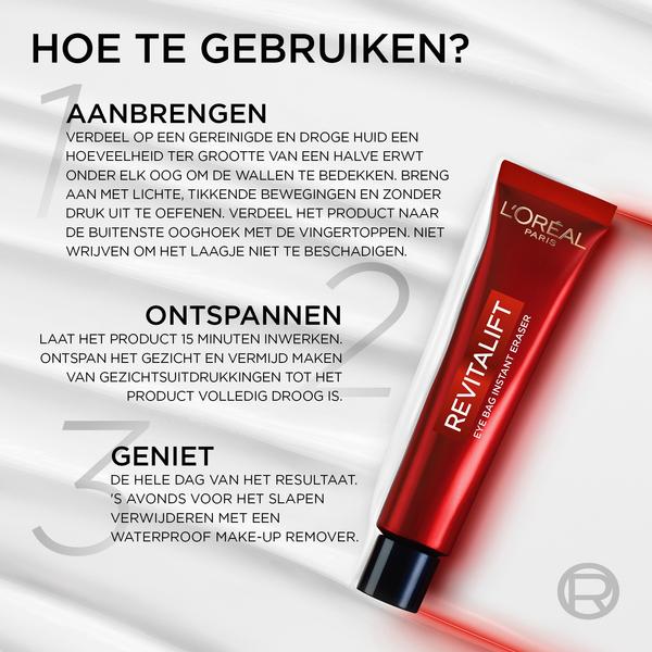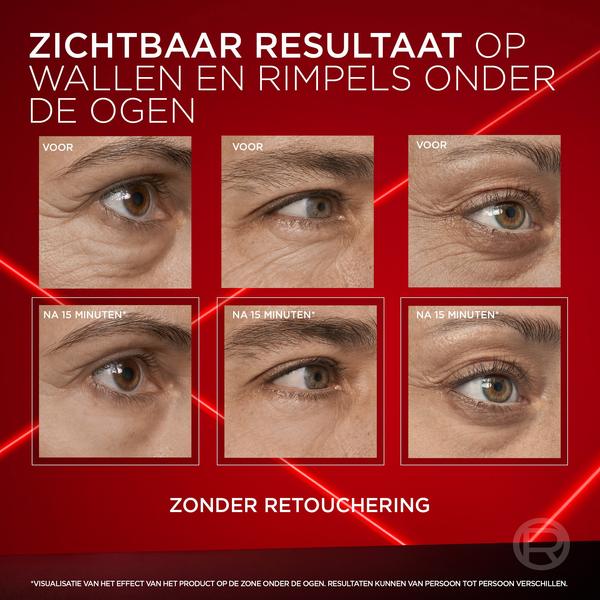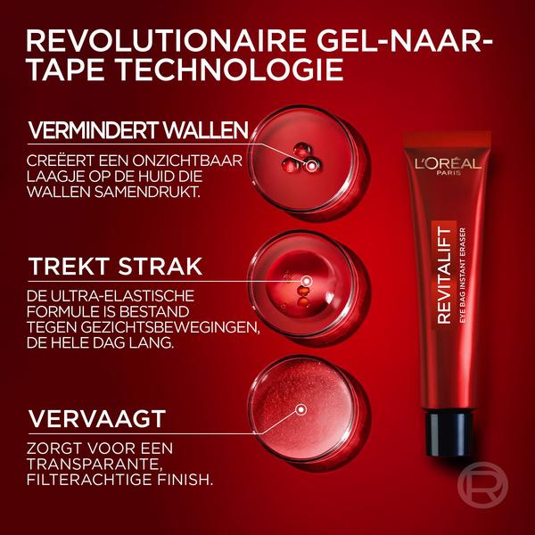 L'Oréal Paris Revitalift Laser Instant Eye Bag Corrector zorgt voor onmiddelijke vermindering van lijntjes en rimpels, wallen en zwelling, verlies van stevigheid en ruwe kreukelige huid rondom de ogen. L'Oréal Paris Revitalift Laser Instant Eye Bag Corrector zorgt voor een dramatisch straktrekkend, ontzwellend en gladmakend effect, waardoor hardnekkige wallen de hele dag door zichtbaar verminderen. Dankzij de revolutionaire gel-naar-tape technologie. De L'Oréal Paris Revitalift Laser Instant Eye Bag Corrector transformeert in een onzichtbaar laagje dat gezichtsbewegingen weerstaat en comfortabel aanvoelt. Ervaar het verschil in slechts 15 minuten*. Geschikt voor alle huidtypen. Oftalmologisch getest. Lees voor gebruik goed de gebruiksaanwijzing.