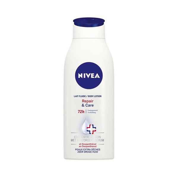 Voor de zeer droge, trekkerige huid ontwikkelde Nivea de Repair & Care bodylotion, een rijke maar niet vette formule met verzorgend serum en dexapanthenol. De lotion versterkt de natuurlijke barrière van de huid en voorkomt vochtverlies, zodat je huid wel 72 uur lang comfortabel en gehydrateerd blijft.