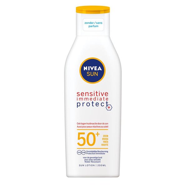 Met de Sun Sensitive Immediate Protect SPF 50+ van Nivea ben je onmiddellijk beschermd tegen de schadelijke invloed van UVA en UVB. Ook tegen huidreacties op blootstelling aan de zon is deze zonnecrème doeltreffend. De formule, verrijkt met biologische aloë vera, werd speciaal ontwikkeld voor de gevoelige huid, is ongeparfumeerd en waterresistent.