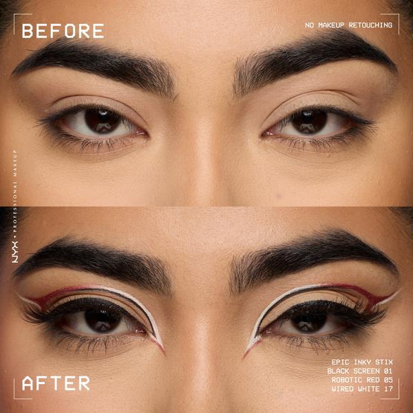 NYX Professional Make Up Epic Inky Stix Eyeliner is jouw nieuwe wapen voor epische ooglooks! De ultra-romige, sterk gepigmenteerde formule glijdt naadloos over je ooglid, terwijl de schuine punt je in staat stelt om zowel fijne wings als opvallende grafische lijnen te creëren. Verkrijgbaar in 16 inky tinten, van subtiel tot spectaculair, voor eindeloze creativiteit. NYX Professional Make Up Epic Inky Stix Eyeliner is onderdeel van onze uitgebreide eyeliner collectie. Of je nu gaat voor de oogverblindende veelzijdigheid van onze kleurrijke Vivid Rich Eyeliners, de waterproof gedurfde Epic Wear Liner Sticks, of de dramatische precisie van de Epic Inky Stix Eyeliner zelf, wij hebben de perfecte lijn voor jouw verhaal.