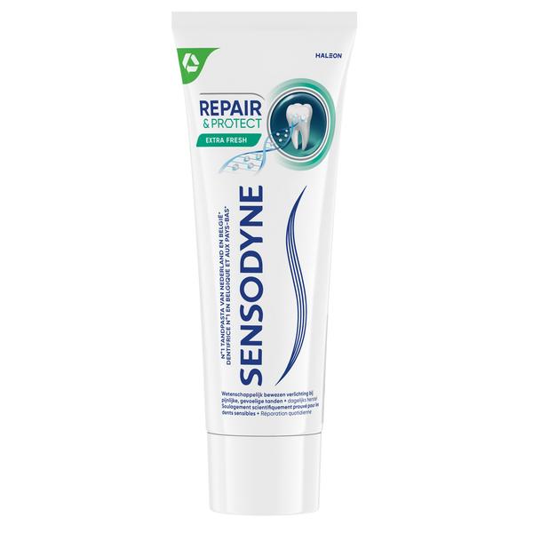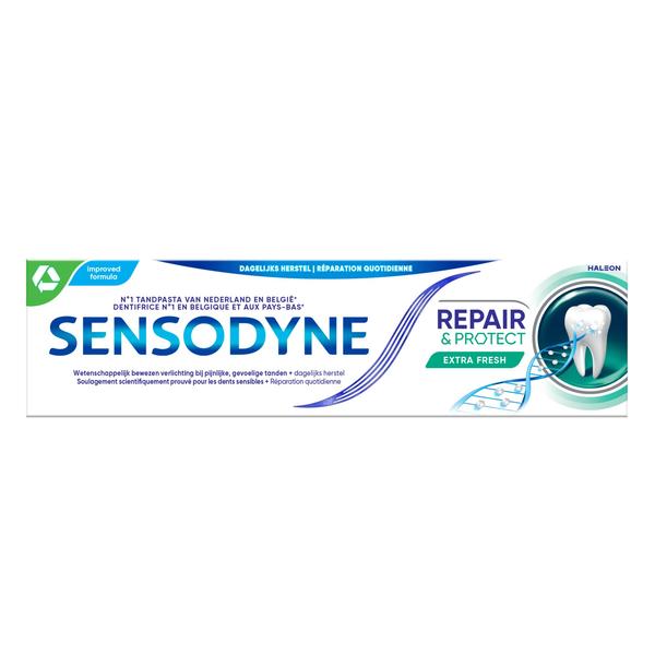 Sensodyne Repair & Protect Extra Fresh tandpasta herstelt gevoelige tanden* & verlicht pijnlijke gevoeligheid**. Sensodyne Repair & Protect is een dagelijkse fluoride tandpasta en heeft een recyclable tube, dop & kartonnen doosje. De unieke Novamin formule is klinisch bewezen, ervaar het zelf. Sensodyne: N˚1 tandpasta van Nederland & België voor gevoelige tanden***