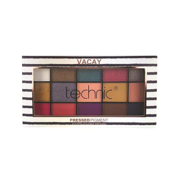 Vacay van Technic is een palet met 15 oogschaduws met geperste pigmenten. Het biedt een keuze uit matte of iriserende afwerkingen in levendige kleuren om een oneindig aantal looks te creëren. Elke kleur kan alleen worden gebruikt of met andere worden gemengd. Dit palet wordt gepresenteerd in een doos met venster.