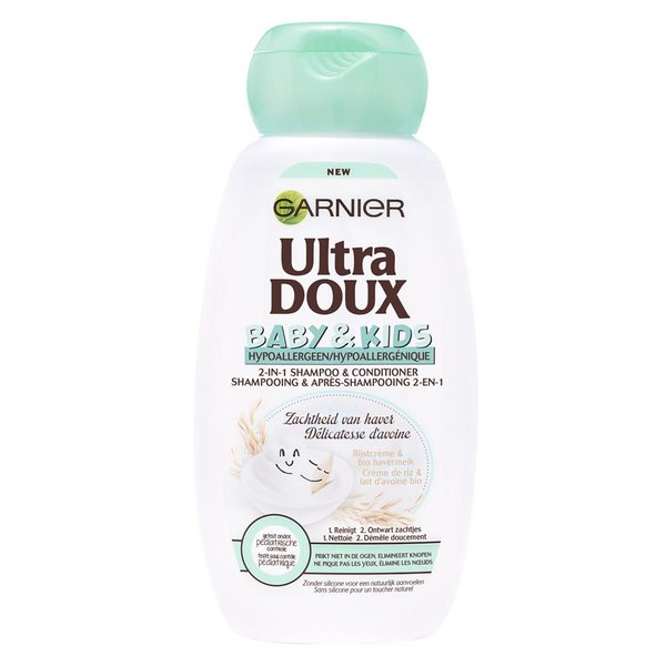 Ultra DOUX presenteert zijn mildste en zachtste recept voor delicateharen en hoofdhuid, nu in een 2-in-1 formule. Biologische havermelk, gekend voor zijn verzachtende eigenschappen op de delicate hoofdhuid. Rijstcrème, al eeuwenlang gebruikt om het haar te hydrateren en te beschermen. Resultaten: ontwart zachtjes, je haar is glanzend en zacht. Ze zijn gemakkelijker te stylen en ruiken heerlijk.